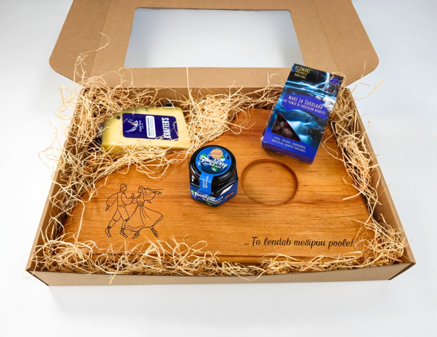 Kinkepaki keskmes on kandlekujuline serveerimisalus, millele on graveeritud rahvatantsijate paar ja luulelised Juhan Liivi sõnad “…Ta lendab mesipuu poole!”. See lepapuidust käsitööna valminud serveerimisalus sümboliseerib laulupidude kütkestavat jõudu ja rahvatantsu elavat energiat, olles praktiline ja kaunis täiendus igasse Eesti kultuuri ja traditsioone hindavasse kodusse. See on sinu praktiline viis hoida laulu- ja tantsupidu enda hinges igapäevaselt!