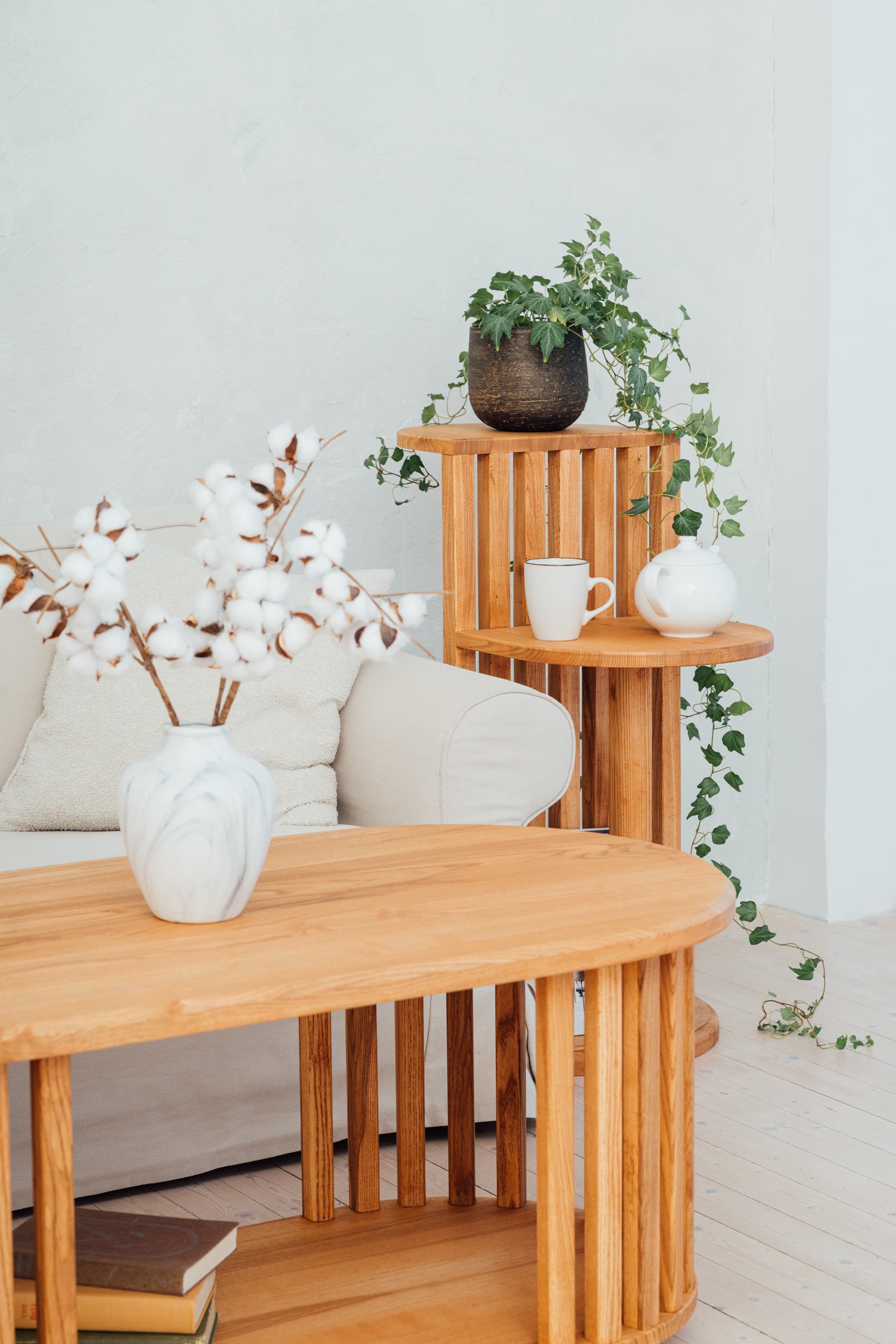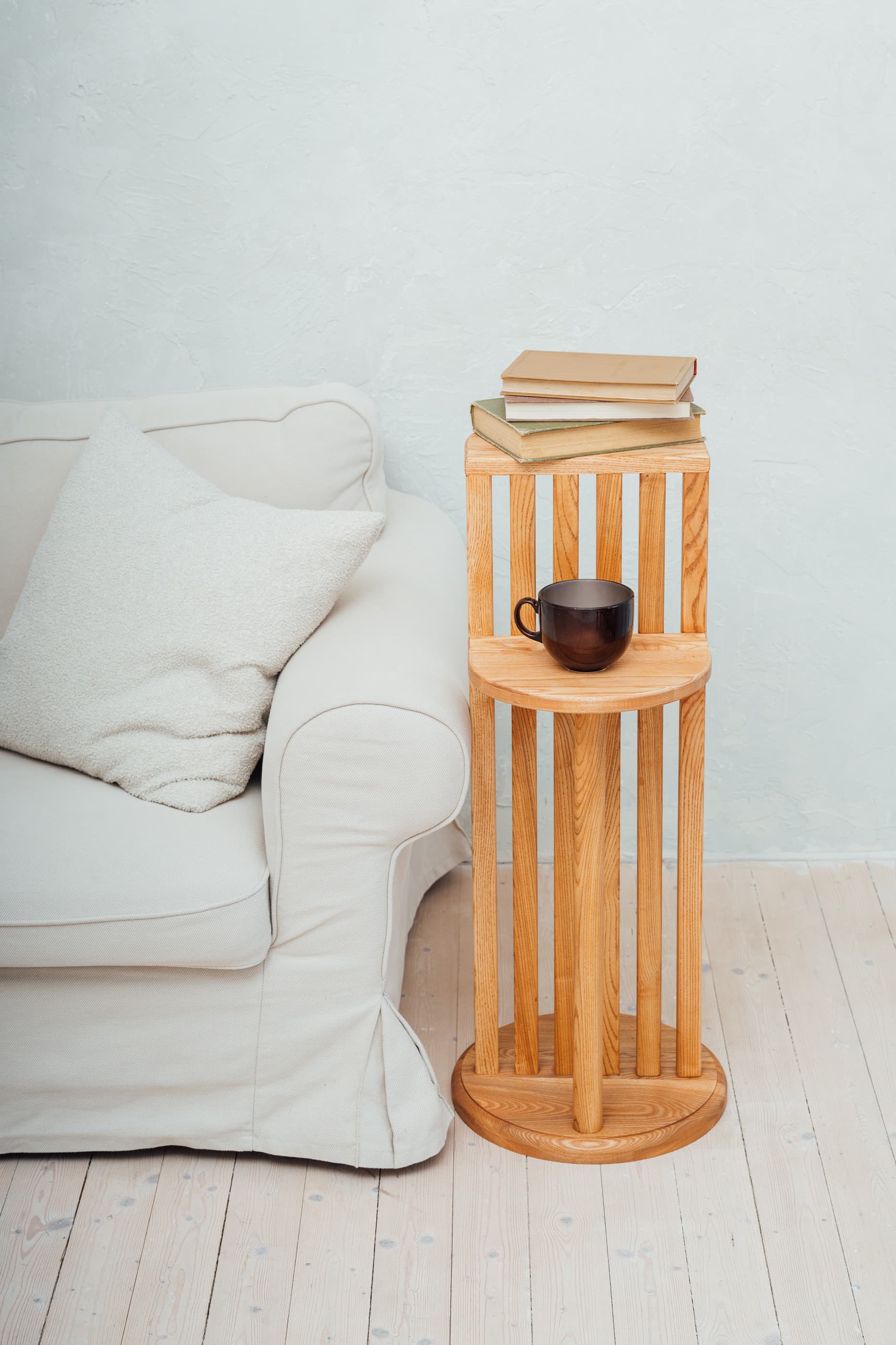 ELIN S on sarja väiksem ja paindlikum abilaud, mis sobib ideaalselt diivani kõrvale, lugemisnurka või magamistuppa. Ovaalne vorm pehmendab ruumi, vertikaalne ribistruktuur lisab rütmi ja visuaalset sügavust. Täispuidust saarepuu elav süümuster jääb nähtavale – iga laud on kordumatu.