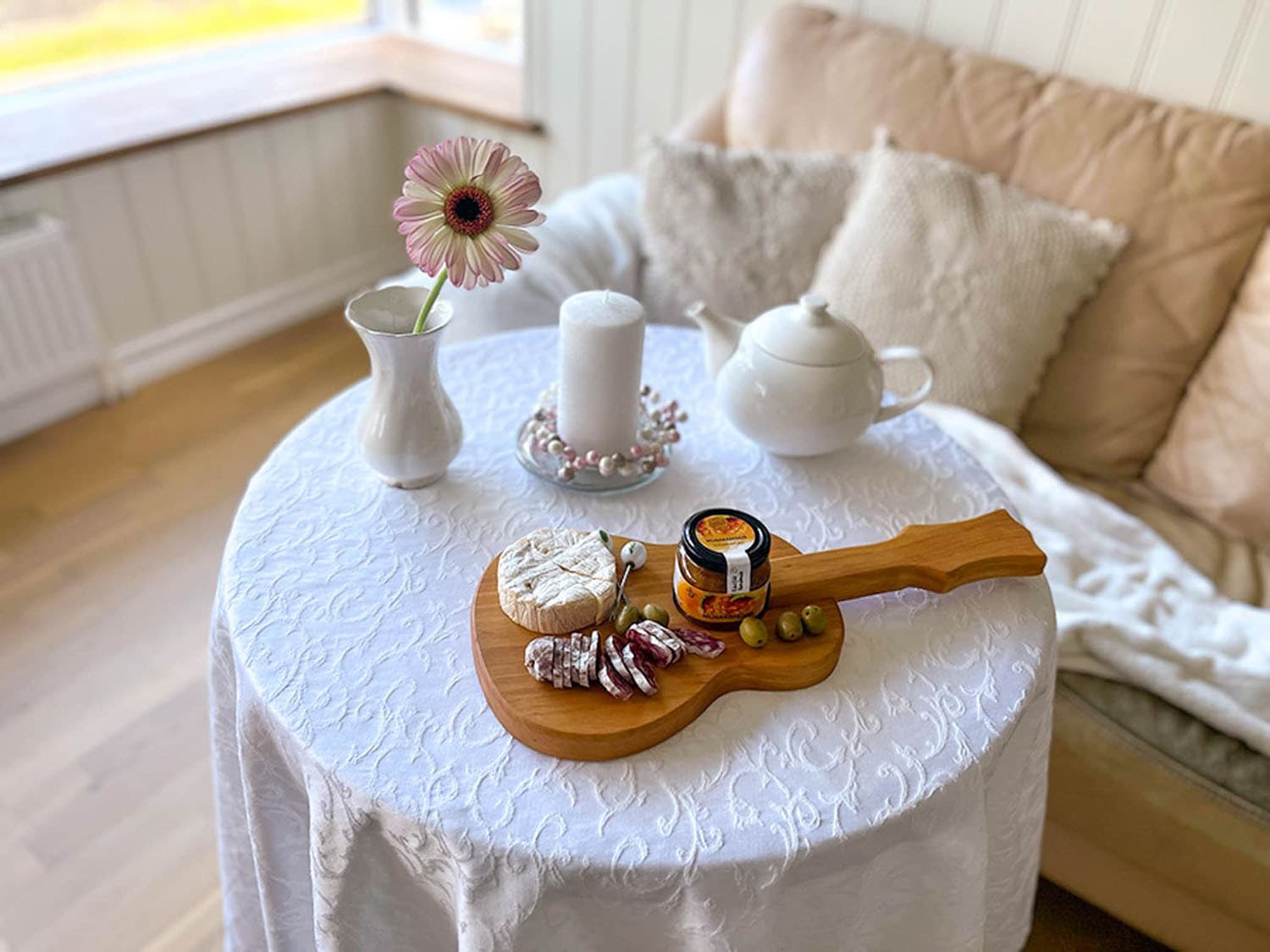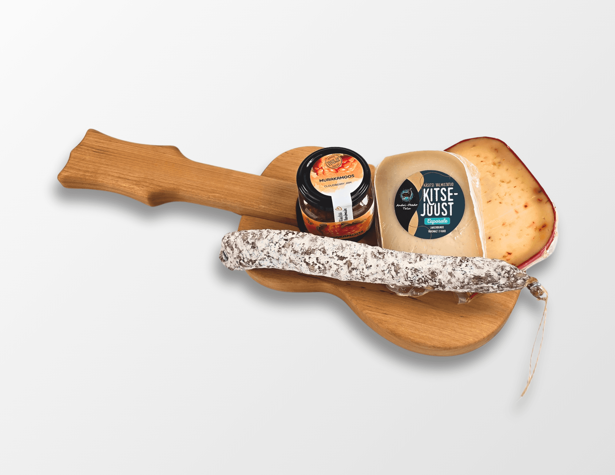 Neli ehedat Eesti maitset – juust, salaami ja viigimarjamoos – kitarrikujulisel puidualusel. Käsitöö, gurmee ja muusika ühes kingis.