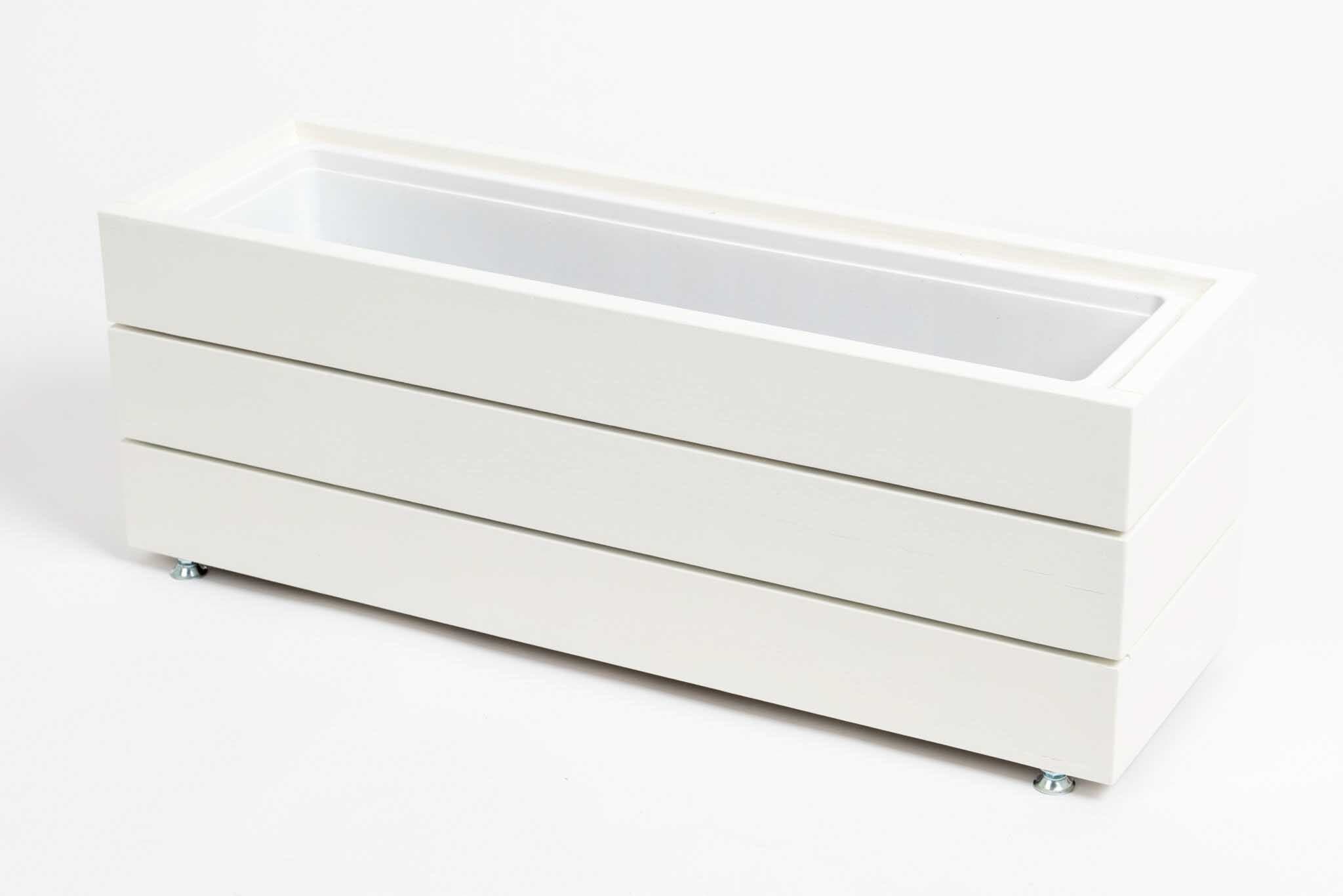 Stabiilsuse tagavad reguleeritavad metalljalad, mis võimaldavad lillekasti kindlalt paigaldada ka ebatasasel pinnal. Konstruktsiooni tugevust hoiavad seestpoolt vastupidavad alumiiniumvinklid ning kõik kinnitusdetailid on peidetud, et säilitada puhas ja minimalistlik välimus ka detailides.